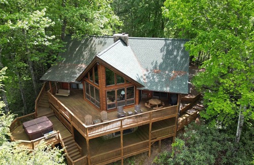 Welcome to High Horse—a spacious, beautifully crafted log cabin perched above Leatherwood Mountains. This inviting retreat features stunning mountain views framed by a grand wall of glass surrounding the cozy, wood-burning fireplace. With three bedrooms, a bonus living area on the lower level, and a quiet loft seating nook, there’s space for everyone to relax in comfort.