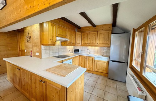 the large, light-filled living area forms the heart of the chalet It's the perfect spot to unwind by the wood-burning fireplace after a snowy day, wrapped in a warm blanket with a hot chocolate, while admiring the breathtaking mountain views. The dining area features a large, friendly table ideal for shared meals with family or friends. The open kitchen is spacious and fully equipped with a generous countertop, two raclette grills, a stone grill, fridge with freezer, traditional oven, dishwasher, microwave, hand blender, filter coffee maker and Nespresso machine, toaster, kettle, and teapot. A cozy lounge area with a TV completes this welcoming space.