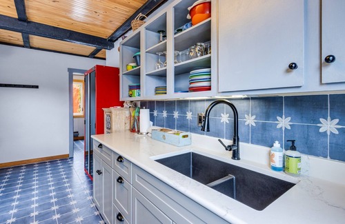 it's a warm and inviting space with tile and wood floors, natural wood ceilings, and plenty of windows throughout Enter by way of the fully appointed kitchen (no dishwasher) and move into the living room, where you'll find a comfortable sofa, a small dining table, and a smart TV (guests must log in using their own accounts) to watch in the warmth of the wood-burning stove. A private balcony is just through the sliding glass doors, where you can sip your coffee, enjoy your breakfast, or browse the free WiFi in the shade.