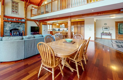 the group chef will love the well-equipped kitchen boasting double in-wall ovens, a large island, a dishwasher, a toaster oven, a coffeemaker, and much more All you need are fresh ingredients! After indulging at the dining table or the bar, clean up and pull out board games to play across the table, or head out to the deck for some fresh air.