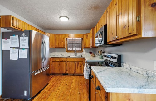 indulge in the comforts of home with the cabin's thoughtful amenities, including a fully stocked kitchen, a cozy fireplace, and a convenient washer and dryer Enjoy quality time with your loved ones in the spacious living room, or challenge them to a game of ping pong in the dedicated game room.