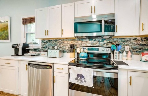 kitchen: top-of-the-line appliances and fully stocked with pots, pans, cooking tools, spices, and dishware and utensils, dishwasher, toaster, keurig, microwave, and blender