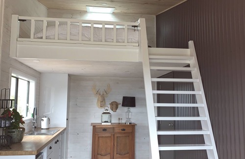 the tiny house is located on our farm and approximately 50 meters away from the house You will have your own separate and private space. You will have the use of a BBQ and fire pit (fire restrictions will apply) so that you can relax while taking in the view. Gaze at the stars while laying in bed through the skylight window.
