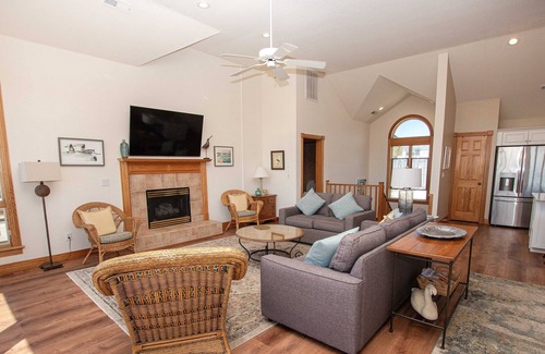 top level: features a king master bedroom with flat-screen tv, deck access, and a large bathroom Great room with flat-screen 65" smart TV/DVD and gas fireplace, large kitchen with breakfast bar seating 4, dining room seating 10 and a half bath. beautiful sound views from all top-level rooms!