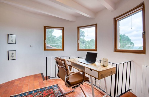 the interior of the house will surprise you A decorative style that combines Empordà rustic with modern touches will make you feel at home. A spacious and bright living-dining room with access to the terrace with garden views, fully equipped independent kitchen. Three bedrooms and two bathrooms. The first bedroom is double and has a double bed and wardrobes. The second bedroom has two single beds and is equipped with wardrobes. Between both bedrooms, there is a spacious bathroom with shower. The third and last bedroom is suite-style: a large bedroom with a double bed, a dressing area, and an enormous bathroom with shower and bathtub. The house has stairs that will take you to the top of the tower where there is a desk for those who need a workspace for teleworking or studying.