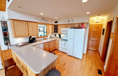 the fully-equipped kitchen, dining room and main living spaces all flow together for a roomy, light and open floor plan Big 60” LED TV for viewing your favorite shows/movies on the reclining leather sofas. The stone, gas-log fireplace is perfect for gathering around during those cooler months. Sit around the dining room table as a family and admire the mountain views out the windows as you enjoy your meals. or, dine outside on the deck!