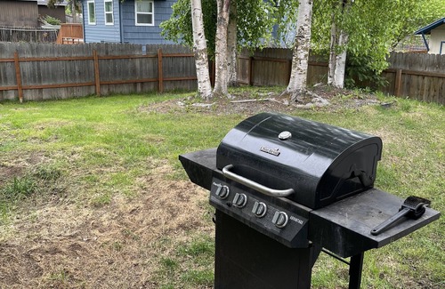 Sleeps 16 people: 5 bedrooms, 2 1/2 bath house, 2 car garage (currently unavailable) and located only 8 minutes from Ted Stevens Airport. Master suite and bathroom on main level of house, an office with desk, printer, and HDMI cord to connect computer screen to your own computer/laptop on main level. Fully equipped kitchen with all cooking utensils, pots, pans, plates, bowls, cups, and all other kitchen supplies for cooking and/or eating, kitchen table that seats 6, but has extension to seat up to 8 plus a huge counter top, coffee pot, toaster. Living room has couch with recliners on both ends, love seat with recliners, and a reclining/rocking chair, 75" Samsung television with Directv.