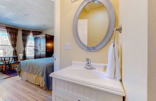 the entire property consists of separate retreats, each with a full kitchen and a separate entrance The main duplex boasts a beautifully decorated, light-filled open floor plan that seamlessly combines all living spaces into one. Discover a welcoming living area adorned with unique paintings, vintage items, and numerous books. Prepare culinary masterpieces in the well-appointed kitchen, complete with all stainless steel appliances that will make cooking a breeze. On this level, you can also find one bedroom and a beautiful bathroom with a shower and a separate soaking tub. The upper level boasts a spacious bedroom with a working desk and an en suite bathroom with a clawfoot tub.