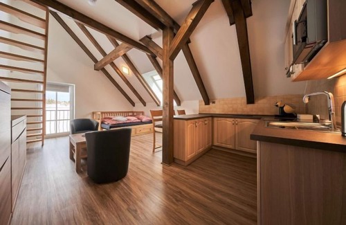 "na pomezkách", 2-room apartment 45 m2 on 2 levels on 1st floor Bright, very beautiful and wooden furniture furnishings: open living/dining room with 1 double bed, dining table and satellite TV (flat screen). Kitchenette (4 ceramic glass hob hotplates, kettle, microwave, electric coffee machine). Shower/WC, hydro massage shower. Heating. Upper floor: gallery with sloping ceilings, without wardrobe with 2 beds. Marvellous panoramic view of the countryside. Facilities: hair dryer. Internet (WiFi, free). Please note: suitable for families. Non-smokers only. No lift. Instead of an enclosed bedroom, some sleeping areas are located in an open-plan area (gallery, alcove, etc.).