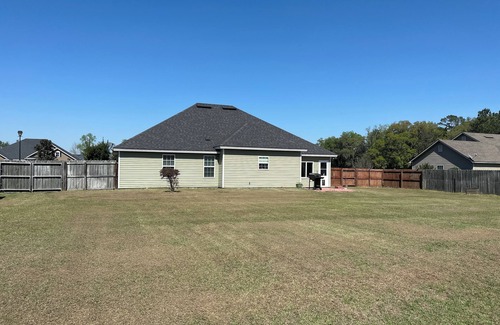 a big four bedroom two bath open living area for dining kitchen and living room gatherings. Fenced in backyard with cornhole and horseshoes. You can even set up a volleyball net. There’s a closet with all kinds of games and coloring books for the kids in case it rains. Wild Adventures is only 4 miles down the road . we are close to the Valdosta airport. About 15 minutes away from the Valdosta State University. Oh did I mention that there’s barbecue grill there and a fire pit camping chairs to be able to sit outside. You can have family gatherings there if you wish family reunions, the house can very easily handle 25 people for a gathering. It sleeps eight people comfortably..