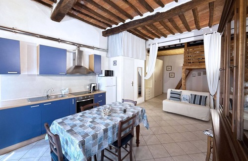 studio with mezzanine 2+2 beds Independent entrance, has a double bed in the sleeping area, a single bed in the wooden mezzanine perfect for an adult or a child and two more places in the double sofa bed. Welcoming spaces with rustic Tuscan style furnishings, and ceilings with exposed beams, create a warm and authentic atmosphere. The living area includes a modern kitchen with fully equipped induction hob and relaxation corner with TV. Bathroom with shower.