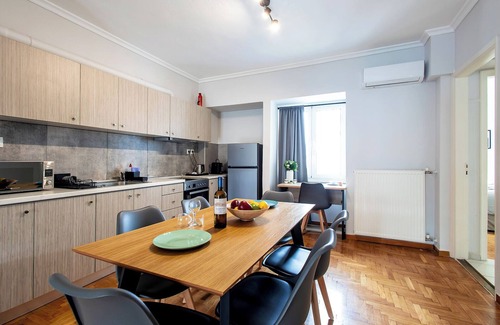 Immerse yourself in the cozy embrace of our 6th-floor Athens apartment, designed with your comfort in mind. This space is outfitted with modern conveniences: air conditioning, a fully furnished kitchen for your culinary creations, and a 50" flat-screen TV with streaming services for entertainment. The private bathroom, complete with a shower, hairdryer, and complimentary toiletries, ensures your daily refreshment. Relax into the warm and elegant living room and and feel like your home..