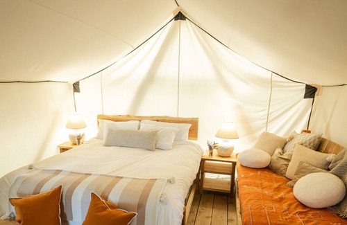 the tent cabins combine a traditional canvas wall-tent with a cedar entryway and en-suite bathroom Beds are ultra plush organic latex and wool mattresses on custom salvaged wood frames. Our beds have been designed to provide flexible sleeping options, as they can be configured as kings, singles, or bunk beds. Other interior furnishings in the tent-cabins combine vintage and custom salvaged wood furniture. En-suite bathrooms have flush toilets, sinks, and face and hand towels. Tents have electricity with interior and exterior lighting, and outlets throughout.