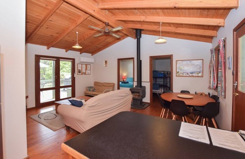 the property consists of two thoughtfully positioned cabins that are separated enough to provide privacy despite a shared backyard The Pelican cabin features two bedrooms, one with a queen bed, the other with two sets of bunk beds, an open plan living space complete with a cozy slow combustion fire and a reverse cycle air conditioner. The cabin has a well equipped kitchen with an outdoor deck complete with a BBQ..