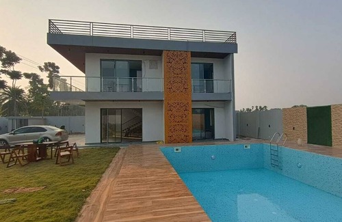 Escape to our Earth Villa with a grand pool, nestled in nature's heart. Fully furnished 4 pool-facing rooms and a with 6 washrooms, security ensures peace. Enjoy a spacious lawn. At the end of the day, retreat to the comfort of your Earth Villa and bask in the tranquility of your surroundings. Whether you're seeking a romantic getaway, a family vacation, offers the perfect blend of luxury, comfort, and natural beauty. Book your stay today and experience the magic of our Earth Villa for yourself..