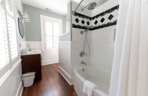 the navigator room is located on the second floor and receives beautiful natural light throughout the day It features a queen-size bed and comfortable chairs for reading. The private en suite bathroom has a subway tile rain head shower and extra deep tub.