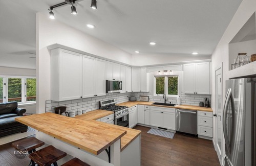 this is a multi-level home, with a spacious and functional floorplan The main level contains a large living room with gas log fireplace, dining area, custom kitchen, and half bath/laundry room. The kitchen is fully stocked everything needed to prepare a wonderful meal, and is equipped with stainless steel appliances, custom cabinetry, and butcher block countertops.
