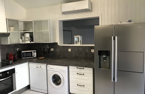 the kitchen includes a washing machine, a dishwasher, an american fridge with ice maker, a built-in oven, ceramic hob, a coffee maker, a nespresso, microwave and a dishwasher