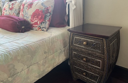 King size poster teak bed, Large closet, desk and small frig. Private adjoining large balcony overlooking the gardens and hills. Black out shades and netting. Villa in a secure and gated community with tennis court and community swimming pool. Quiet home with view of mountains. Large living and dinning rooms with separate modern kitchen and pantry with washer and dryer available..