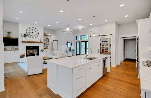 the open concept floor plan of owls nest really lends itself to entertaining and relaxing with family and friends The great room, kitchen and dining area is surrounded by 12 foot ceilings and huge transomed windows all around, which brings the outdoors in! The great room has a huge white shiplap fireplace with custom cabinetry, hardwood flooring and sliders opening to the patio, hot-tub, grilling and fire-pit area. The kitchen has high-end stainless appliances, white quartz counters, a walk-in pantry and a breakfast/dining room with a huge Restoration Hardware country dining table, surrounded by windows. this gourmet kitchen comes fully stocked!