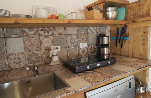 the kitchen-living room is modern and comfortable to use, equipped for cooking with induction plate, melitta, kettle, stainless steel pots, cutlery dishes and everything you need for cooking and even with dishwasher