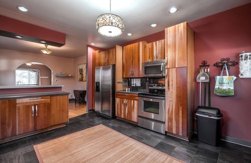 kitchen has everything you need to make this house feel like a home Keurig coffee maker, all pots/pans/baking items/flatware/dinnerware included. Large refrigerator, electric stove, oven, and dishwasher.