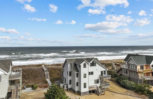 sandy treasure is an oceanfront house located in the quiet community of sanderling in duck The community provides access to the pristine, private beach, free access to a shared pool, and use of the tennis and pickleball courts for a small fee (paid at the clubhouse - located 1 mile north). Sandy Treasure's entire interior is finishing up a complete renovation before the 2025 season to provide a true luxury oceanfront experience. Complete with a newly remodeled master bedroom secluded on the top floor with a large walk-in master shower with two rain heads, hand sprayer, and large bench. Two 42" vanities provide plenty of counter space and a separate water closet for added privacy. A remodeled kitchen provides tons of counter space and beautiful ocean views, a Sub-Zero refrigerator, a wine fridge, an additional drink fridge, a 2nd sink in the large island, a 2nd smaller island within the kitchen, providing and fully stocked with quality cookware and kitchenware. Enjoy all the ocean views through the MASSIVE amount of windows and open floor plan in the family room, which shares space with the dining table and is next to the kitchen. Leading from the kitchen is the game room waiting to create fun memories for the entire family. Everyone will enjoy Golden Tee and Ms. Pac-Man arcades (with 20+ other arcade games), Fast and Furious racing, Wheel of Fortune slots, foosball, and a closet filled with more games and books. The house includes three (3) king bedrooms with comfortable gel memory foam mattresses and one (1) room with two sets of bunk beds with the same comfortable mattresses. The ocean access is on the north side of the house (left of front stairs) with a wooden walkway leading to several steps up to the sandy, pristine, and secluded beach.