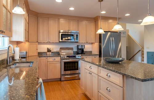 spend your vacation in this inviting and spacious two bedroom, two bathroom split-level home The first level is an open concept featuring a combined living, kitchen and eating area with a ductless split air conditioning unit. The kitchen features custom cabinetry, granite countertops and a large island, perfect for pancake breakfasts! The dining area seats six comfortably, or choose to eat outside on the patio, accessed easily from the sliding door. A bunk room perfect for the kids in your party, or young at heart, is off of the living area. In addition there is a full bathroom and laundry room. There is a staircase off the main level leading up to the primary bedroom with en-suite bathroom, private deck access and ductless split.