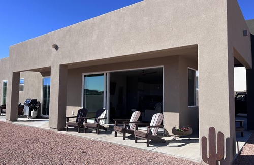 New home located in the highly desirable, quiet Greenehaven neighborhood just minutes from Page, Wahweap Marina, Antelope Canyon and so many other adventures. Enjoy the views of Lake Powell and the sunset alpenglow on the canyon walls from the oversized 15 ft sliding door in living room, 8 ft slider in master bedroom and 6 ft slider in back bedroom. Four Smart TVs, free WiFi, washer/dryer, patio furniture, BBQ grill, fully equipped kitchen with gas stove, dishwasher, air conditioning and ceiling fans in each room. Towels and bed linens are included.