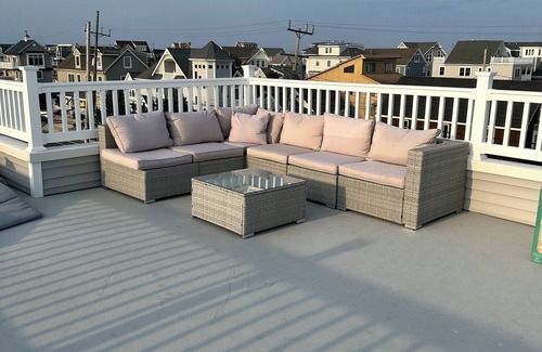 Beautiful new beach house just one short block to a PRIVATE beach! 10 beach tags included. Rooftop deck with beautiful sunrise and sunset views. 4 bedrooms, 3 1/2 bath plus outdoor shower. Elevator from ground floor entry to 1st floor living space and 2nd floor bedrooms. Master bedroom with private balcony. Two more balconies off bedrooms/sitting areas plus a spacious deck off kitchen/living area. Smart TV in each bedroom. First floor sitting room with desk and wireless printer in case you need to 'work from home'. Secured Wi-Fi accessible on all levels including the rooftop! Kitchen with gas stove, beverage/wine fridge and stand-alone ice maker! Full house generator. @deauvillebeachnj.