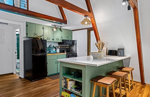 Welcome to The Tail of the Dingo. This unique 2 bed 2 bath A-Frame that sleeps six, combines contemporary decor & modern amenities with 1960's charm. Explore and enjoy what lake Santeetlah has to offer & take it easy at this unique and tranquil getaway. Nestled in the trees with serene lake views, just minutes from lake access. Peaceful mornings & fun filled afternoons await you. Newly renovated with 2 king beds, sofa bed, game room, fully stocked coffee bar & covered hot tub. you'll have it all