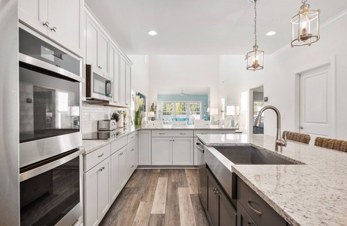 there are many upgrades throughout the home including a gourmet kitchen with stainless steel appliances, a large kitchen island with granite counter tops with and extra large deep farm sink A beautiful dining room which seats 6-8 comfortably. Ultra comfortable beds with extra blankets & pillows. Super fast free wi-fi, smart TV's is all the bedrooms and a large 75" Qled TV in the Family room for a great fun movie night. Totally furnished with all high end quality pieces. In addition, for those who want to experience the comfort of home without the hassle, a linen service is included in the rates for a complete turnkey experience. This is also a smart house so no keys are necessary.