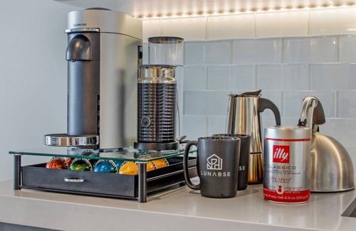 the fully equipped kitchen includes stainless steel appliances, quartz countertops, and all essentials for cooking The dining area seats up to two guests comfortably.