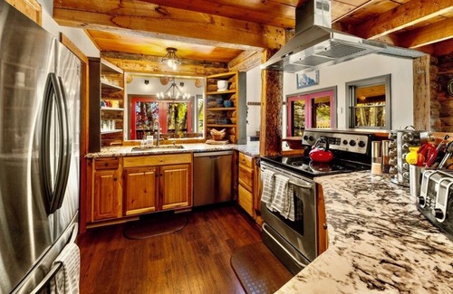 this cozy space is an original cabin that's had multiple additions/upgrades, but still retains the original hearth and stone fireplace, woodwork, and character
