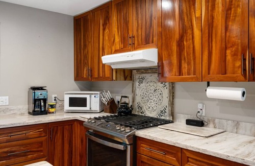 Welcome to this charming 3-bedroom, 3-bathroom retreat nestled in a serene, secluded setting. This spacious home is perfect for families or groups seeking a peaceful getaway. The well-appointed kitchen features rich wood cabinetry and stainless steel appliances, making meal preparation a delight. The adjoining dining area, with its warm wood accents, opens up to a large backyard through sliding glass doors, inviting the natural surroundings inside.