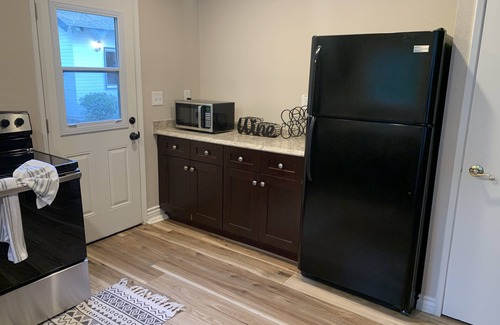 Our newly furnished and remodeled guest house is ready with all the basics you need for a long or short stay. This spacious 1 bedroom 1 bathroom private unit includes a full kitchen with an electric stove/oven, refrigerator, lots of counter space and a nice sized closet pantry. The living room/ dining area includes a table and 4 chairs, a new sofa that pulls out to a double sized bed, smart tv and access to your own private deck overlooking the backyard filled with giant trees, greenery and a pool. The large bedroom features two full sized closets, a California King sized beds workspace with desk, and blackout curtains over the windows to ensure proper sleep no matter the time of day. The spacious bathroom has a shower tub with excellent water pressure, double sink vanity, toilet and a skylight for more natural light. Small, well behaved, housebroken, indoor dogs welcome. Unit is completely detached from main house with private entrance and no shared walls. No animals allowed on property at all. Our Saint Bernard is friendly to humans but extremely reactive to other animal. In order to maintain a safe environment for everyone we do not allow animals on site ever..