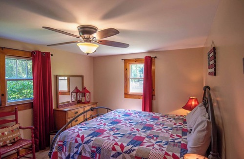 the farmhouse sleeps up to six people, with 3 bedrooms offering a comfortable king-size bed in one, queen in another, and a full in the third Quilts on the bed bring you back in time. In true vintage cottage living, they share a bathroom. Wood floors throughout the farmhouse add to the charm, and you'll enjoy the sounds of the rain on the metal roof.
