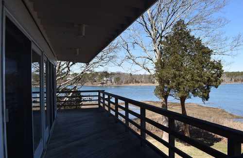 Waterfront home with dock located at the tip of Ockway bay that leads to open ocean (Nantucket Sound). Excellent vacation home that’s large enough for two families: 4 bedrooms (one has 2 sets of bunk beds); 3 full baths and one half; open concept living and dining space with wrapped around front porch giving you ¾ views of the ocean. Access to kayaks with a short paddle to the spit. 55' flat screen in living area with 40' in bunk bedrooms. AC; Pet friendly house..