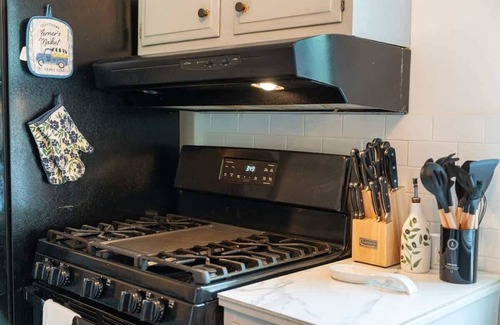 the second unit has a living/dining space downstairs with smart tv This unit has a smaller kitchen with coffee maker, refrigerator, stove and microwave, and a good amount of cooking supplies including a smoothie maker, and waffle iron.