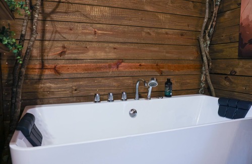 small bunkhouse with jetted soaking tub, bathroom, mini frig, sink and firepit area Electric outside grill and hosts on site. We can interact or leave you alone. Any dog must be on leash at all times when outside. Guests have access to outdoor fireplace area and horses.