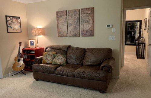 Property is on the second and third floors of a three story townhouse. Main front entrance leads to open space Kitchen, Dining and Living area and a balcony with comfortable seating watching a pond. On the third floor are the two Master Suits, each with adjacent full bath. Bedrooms are each with Queens size beds, the one is convertible sofa with extra padding mattress. Laundry Room is on the same floor. Next to the subdivision is a trail, miles long, perfect for walking/jogging/biking. On a walking distance is downtown Winter Springs with large grocery store, small restaurants some with live music, service areas, Starbucks, McDonalds, Wedndy's, Subway and other small restaurants. Couple of parks are around, one with BBQ pits, large sport fields, pond into the big lake Jesup's for fishing. Ocean fishing is on 45 min drive, closest is New Smyrna Beach, large beach and small art stores and galleries. Disney area and the other parks are also on 45 min drive on South..