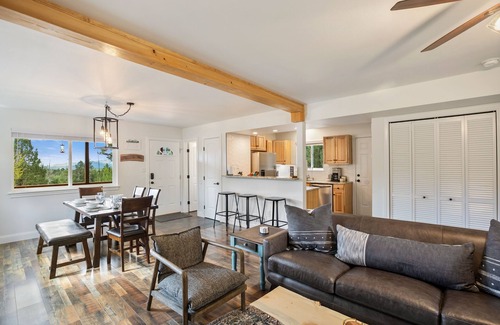 our cozy 3 bedroom 15 bathroom cabin offers 1250 square feet of thoughtfully furnished space. Nestled on 1.3 acres of a hillside you'll feel as though you're relaxing amongst the treetops while also having a walk-out adventure into a forest. We have recently updated the cabin with all-new furniture, linens, beds, art, paint, and a brand-new walk-in shower. Two queen beds and a twin bed with a pull-out trundle offer ample space for sleeping. Our cozy beds will help you dream of coming back again! A designated desk/workspace is located in the primary bedroom if you desire a place to work remotely. We have high-speed internet that will allow you to work and stream if you need to be in a Zoom meeting. The kitchen is well equipped with pots, pans, utensils, spices, and dishes so that you can cook a simple, hearty or intricate meal, or you can head out to dinner at one of the recommended local restaurants. The dining table seats 6 comfortably and after enjoying a meal you can kick back on the leather couch and watch your favorite show on the 55 on a smart TV. on colder nights we have a wood-burning stove that really makes it toasty in the house! play board games with your family and friend or we have everything you need to practice your yoga!