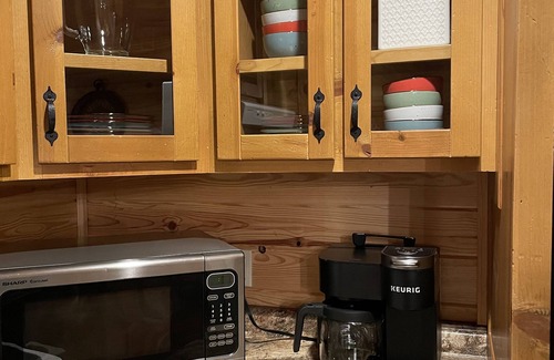 huge kitchen stocked with everything you need but food! coffee center with keurig coffee maker and pods Kitchen table slides out of antique wood island for more seating.