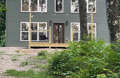 our cabin was just built with comfort, simplicity, and the outdoors in mind — a modern, minimalist retreat surrounded by towering trees, trails, and 100 feet of private lake frontage