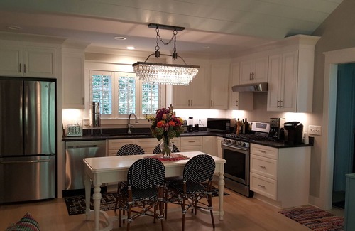 Camellia Cottage was designed to look like it had always been part of the estate; with architectural details that mirror it's mother property in accordance with the historical district's guidelines. Decorated in a midcentury French genre, the original art was collected during the owner's travels to complement an eclectic mix of vintage and modern furnishing. Step inside, however, and you experience the ambiance of contemporary features including a cathedral ceiling in the family room, built-in large screen TV and desk/bookshelf units in each bedroom. Every room offers a visual vista of mature foliage and gardens, unhampered by large paneled plantation shutters.