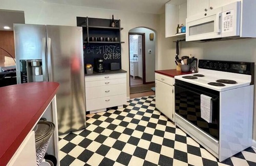 enjoy a stylish '50's experience in this newly renovated, centrally-located place only 3 mins to unmc Close to UNO, trendy Blackstone area, downtown & CHI center. Cozy up to the fireplace or toast some marshmallows in outdoor fire pit. Beautiful bedrooms and full kitchen with cooking essentials. Two bedrooms on main floor, one with large built-in desk space to get your work done. Lower Walk-Out has 3rd large bedroom, Sitting area with TV, Contemporary full bath, and laundry area.