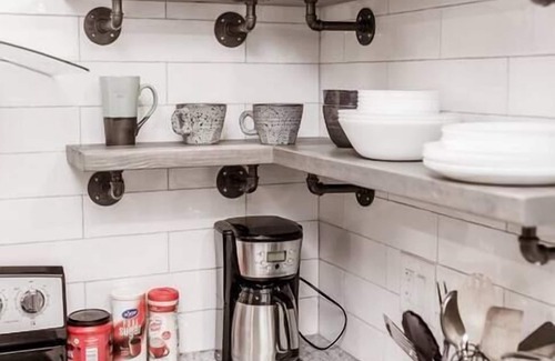 -- kitchen includes refrigerator/freezer , stove/oven, microwave, toaster, pots/pans, cups, wine glasses, dishes, utensils, kitchen knives, coffee maker, and basic cooking supplies such as oil, salt, pepper, spices