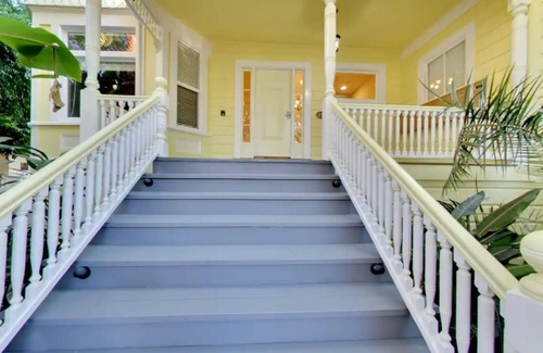 located in a historical victorian building in downtown palo alto, surrounded by manicured tropical gardens