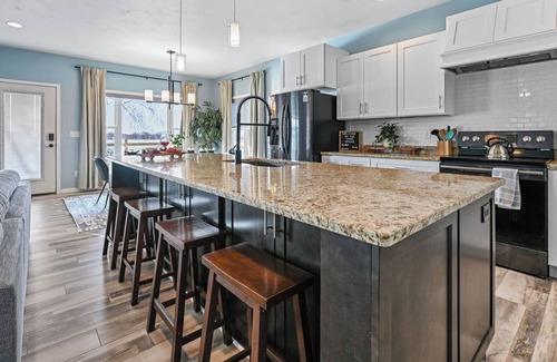 ★ chef’s kitchen with black stainless appliances & island seating for 4