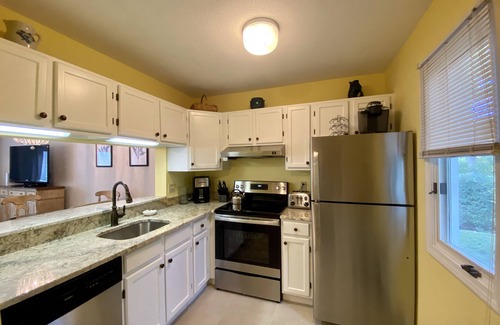 this newly updated, traditional townhouse unit in howland village has been a favorite for guests and recently had the bathrooms renovated The kitchen's new granite counter tops and the Pottery Barn accents throughout give this rental a refreshing look. The open concept living room and dining room were recently updated with new furniture, bamboo flooring, and a 60-inch flat screen TV with DVD player. There is a half bath conveniently located on the first floor. Sliders off the living room lead to a tranquil patio, furnished with a table & chairs and a gas grill for outdoor dining. A straight staircase leads to the second floor where you will find the two bedrooms, a full bath with separate vanity area, and a washer/dryer set. The primary bedroom has a king size bed, flat screen TV with DVD player, AC, and a Juliet balcony that overlooks the private wooded backyard. The second bedroom has two twin beds and is decorated with white wicker furniture that includes a bookcase filled with board games and DVDs for family fun. This prime location rental is a three-minute walk to the Fletcher indoor & outdoor pools, cardio room, and basketball & tennis courts.
